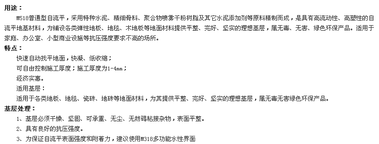 使用場所:M518普通型自流平,采用特種水泥、精細(xì)骨料、聚合物噴霧干粉樹脂及其它水泥添加劑等原料精制而成,是具有高流動性、高塑性的自流平地基材料,為鋪設(shè)各類彈性地板、地毯、木地板等地面材料提供平整、完好、堅實的理想基層,屬無毒、無害、綠色環(huán)保